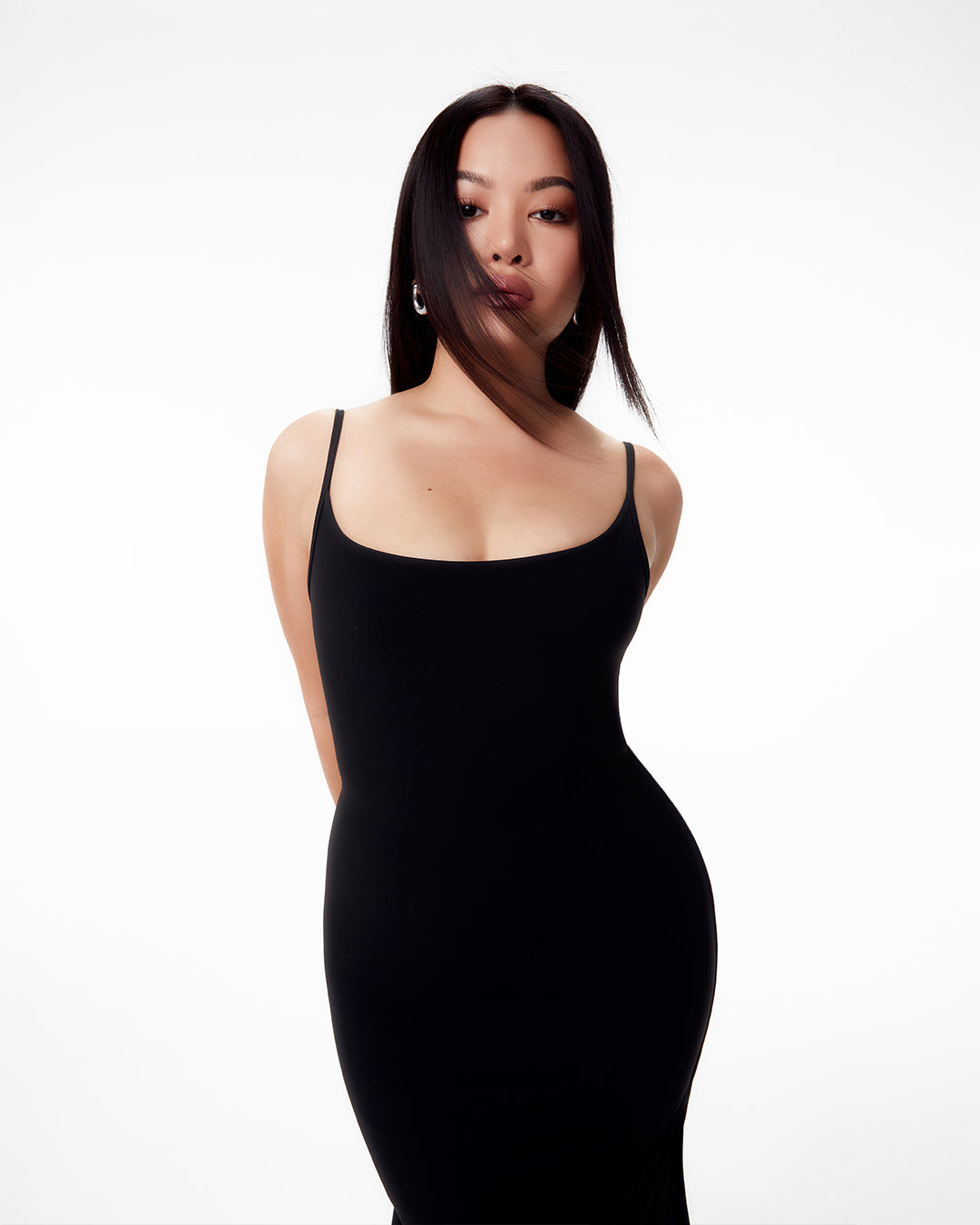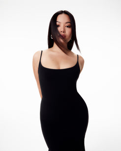Maxi Spaghetti Basic Dress with an open back. Made from a stretchy nylon-Spandex blend for a comfortable, smooth fit. Features double layers for added shaping, adjustable straps, and a timeless design perfect for any occasion.