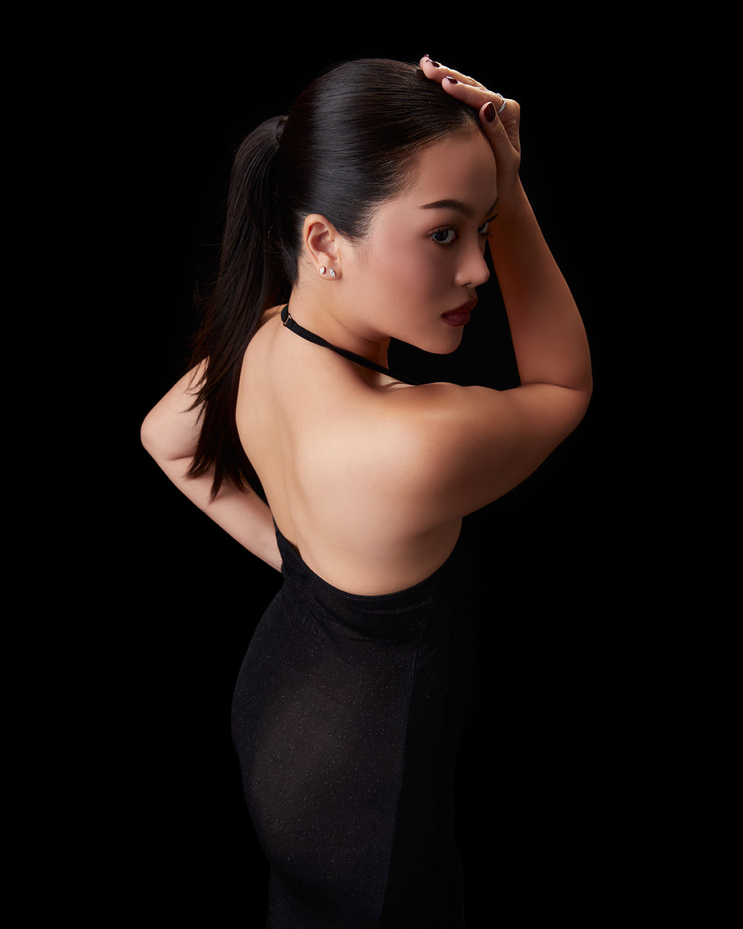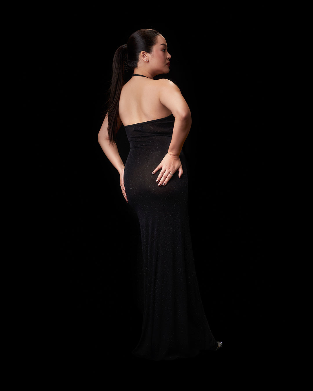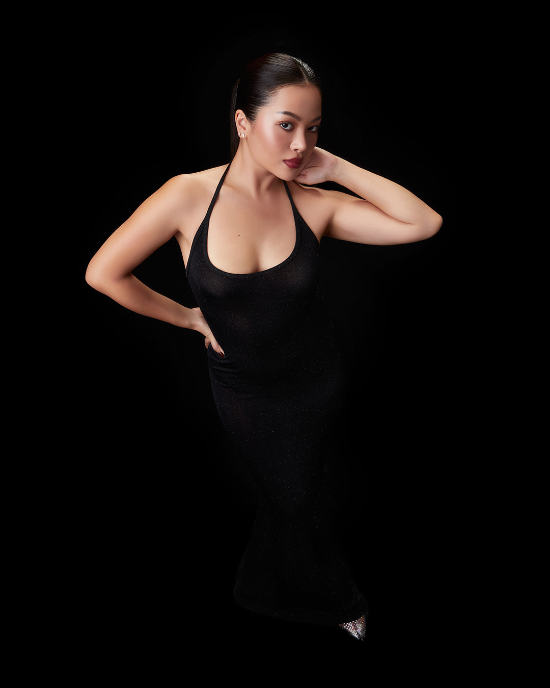 A halter dress with spaghetti straps, an open back,open back. Made from stretch fabric woven with glitter and blended with Spandex, featuring adjustable straps at the neck for a customized fit.