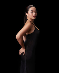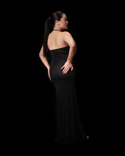 - Spaghetti halter dress with open back, floor-length.