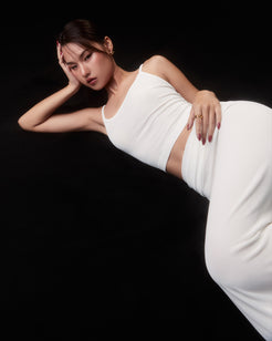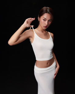Spaghetti tank with an open back, designed with stretch fabric woven with glitter and blended with Spandex. The adjustable straps at the back allow for a customizable fit.